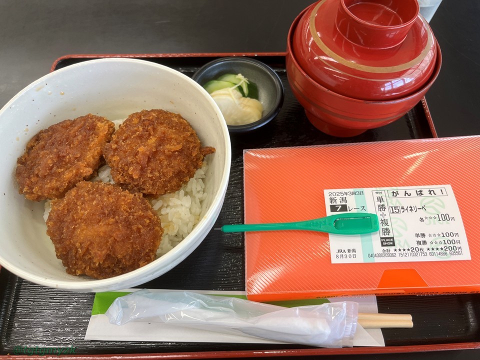 新潟競馬場はタレカツ丼が名物。すなわちカツを摂取しやすい。中でも4階にある和食店が最良な気がしたのでそちらへ。美味しくいただきました。