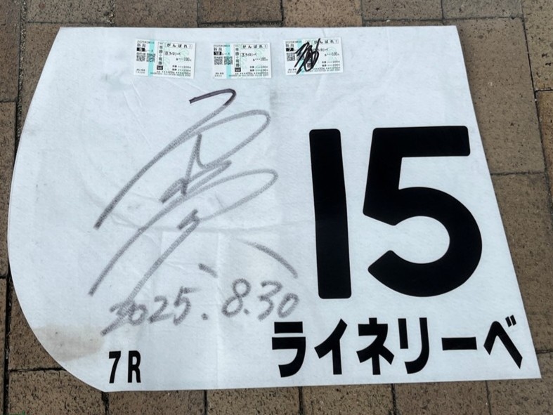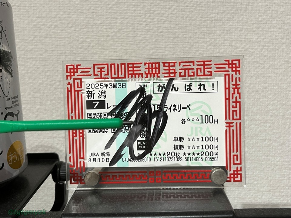 自分が映ってるやつ…は省略。ゼッケン単体を手持ちの馬券ホルダーに入ってたライネ馬券と一緒に撮ってみました。