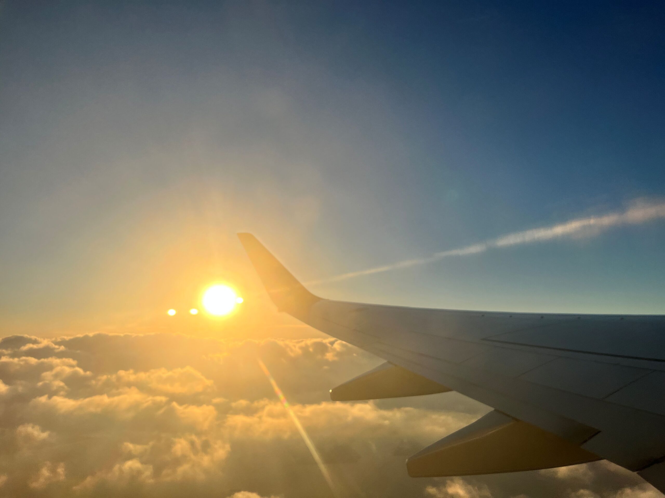今年は2023年元旦以来、5回目となる初日の出フライトでした(※企画商品としての初日の出フライトを利用しているわけではなく、いつも朝イチ便というだけ)。雲が出ていたおかげで離陸前は日が差しておらず、離陸後にご来光。前日まで席指定を忘れていたのですが東側の窓側座席が空いていたことも幸運でした。二重に幸運。